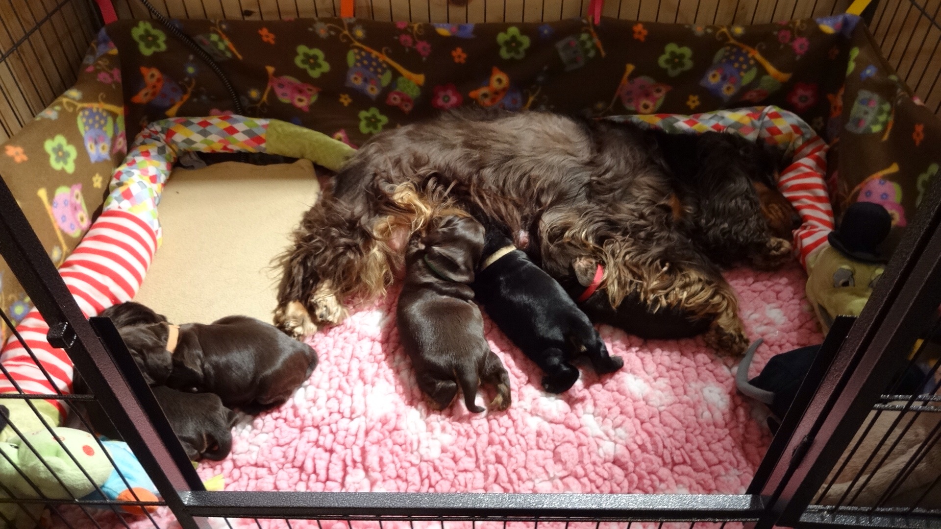 Mit Mama Abby zusammen mussten wir beim Säugen die letzten Tage immer sehr zusammenrücken. Uns hat das nicht viel gemacht – aber Mama konnte sich gar nicht mehr richtig lang machen in der Welpenkiste.