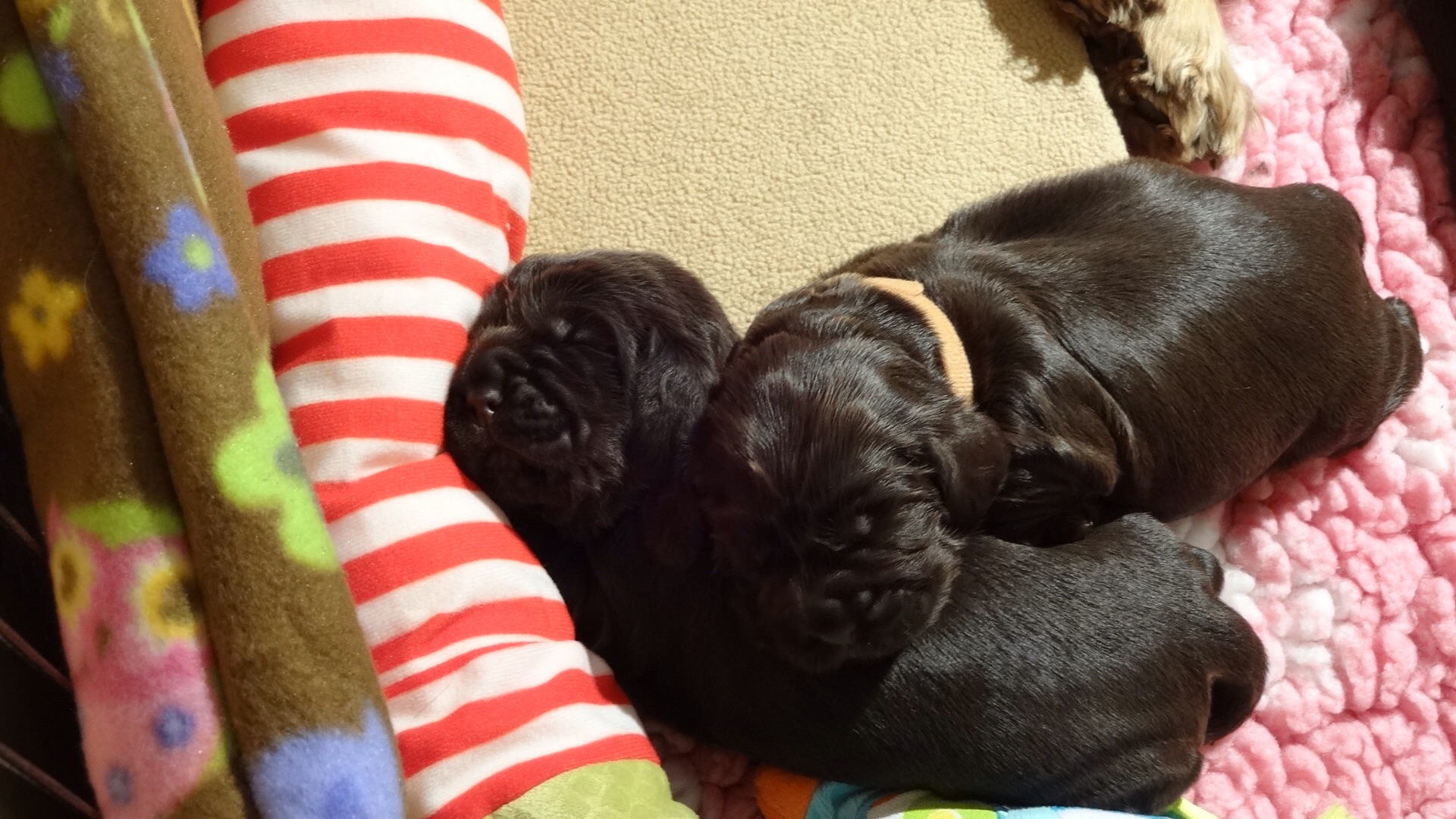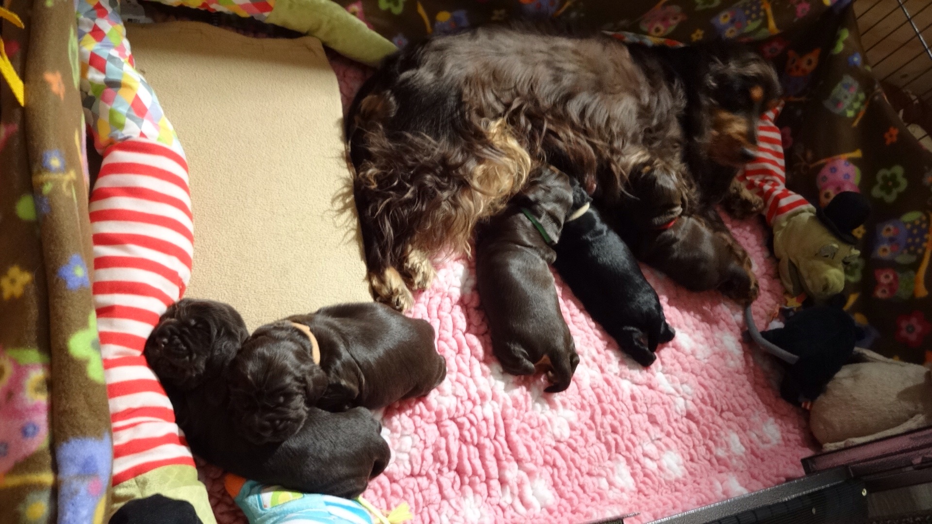 Es können Welpen in den Farben schwarz, schwarz/loh, braun, braun/loh und zobel oder rot fallen. Also – Überraschung!!!!!!
